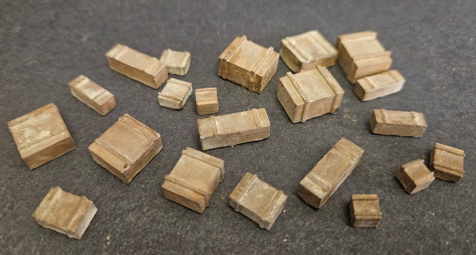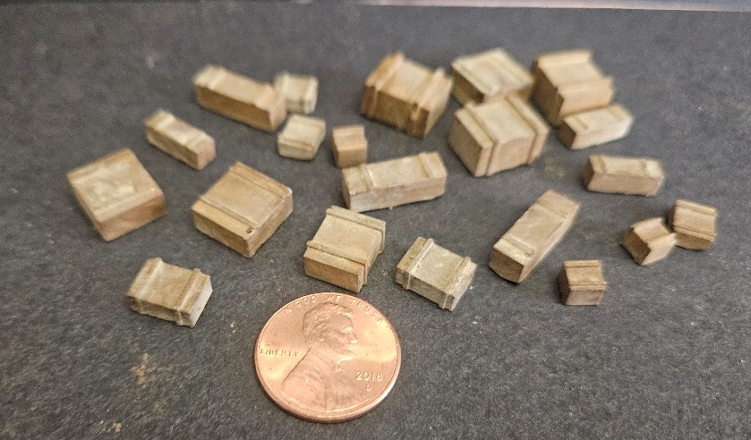 Here we have 20 boxes 2 of each different sizes for your freight house or warehouse. You can see what the items look like painted. These are 3D printed and come unpainted.