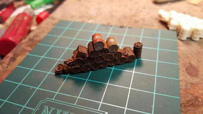 Here is a stack of oil drums that will look great behind any shop building on your layout. If the EPA existed back then you would get fined for this one. The casting is 2 1/8" long and 3/8" deep and 7/8" tall. All resin unpainted casting.