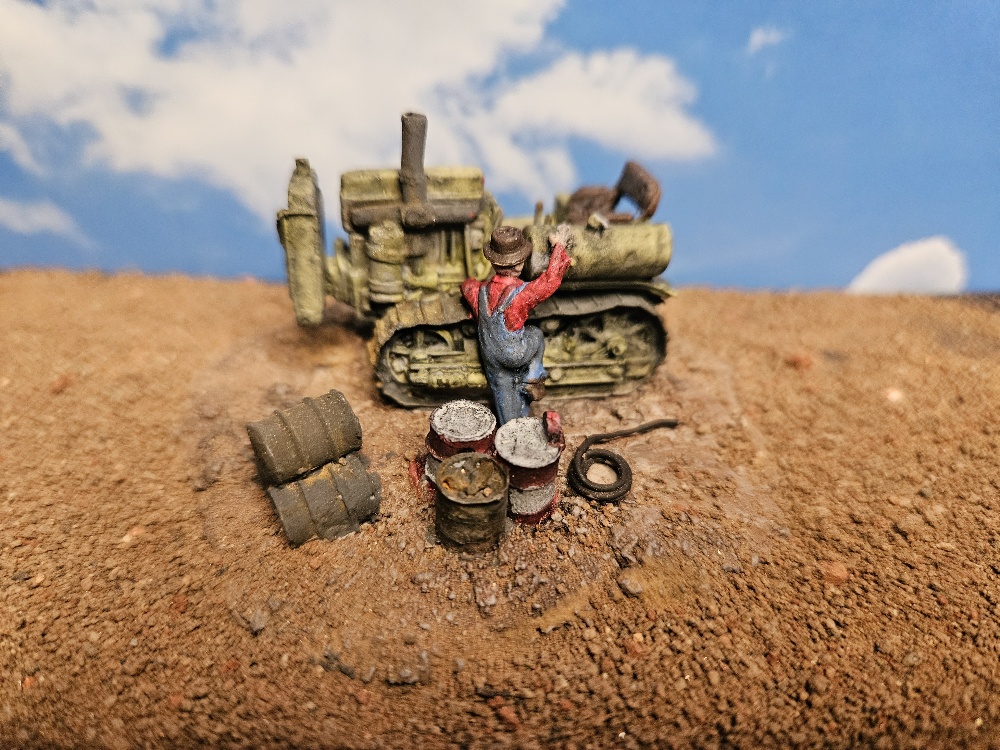 Here is a great little scene that I called 'Back to Work'. This shows a farmer after he just refueled his tractor getting back in the saddle and starting work again. As you can see in the pictures a lot of detail in a small area. I also have one picture showing the casting without the dirt around it. All resin casting. Measures 2 1/2 by 2 1/2" so small footprint.