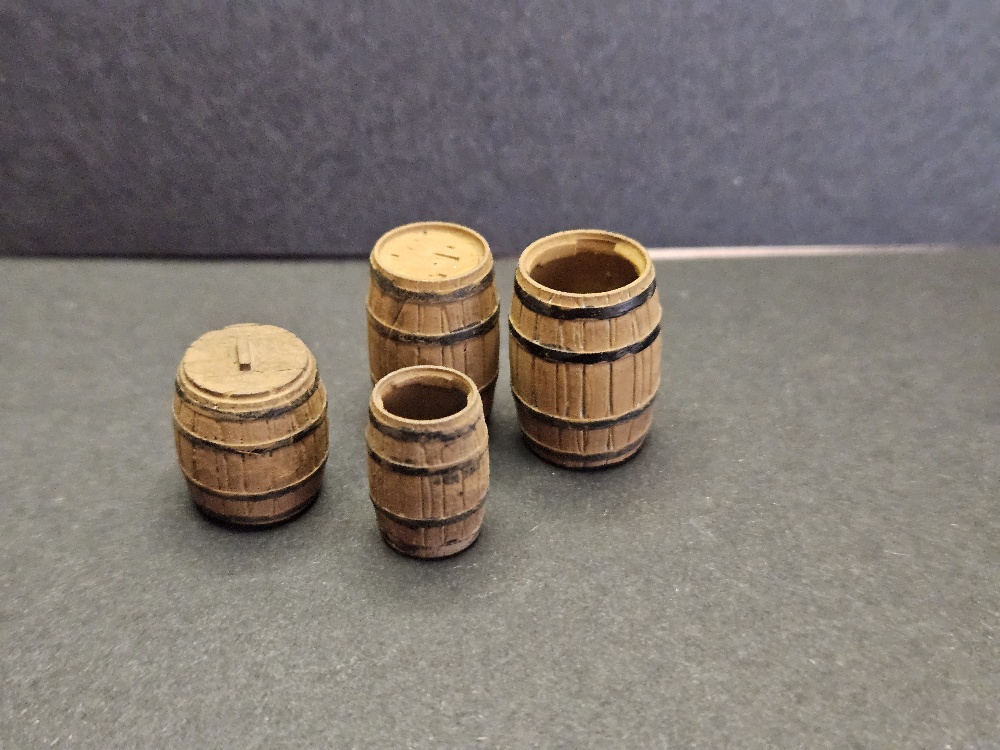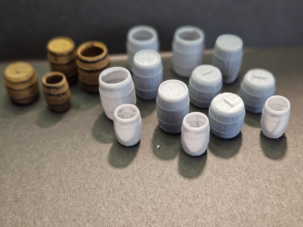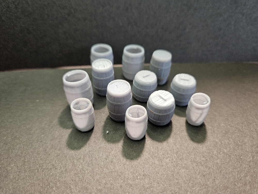 Here we have a set of 3D printed wood Barrels and includes a pickle barrels. The set of 12 barrels total comes unpainted. In the pictures you can see what the wood barrels could look like painted.