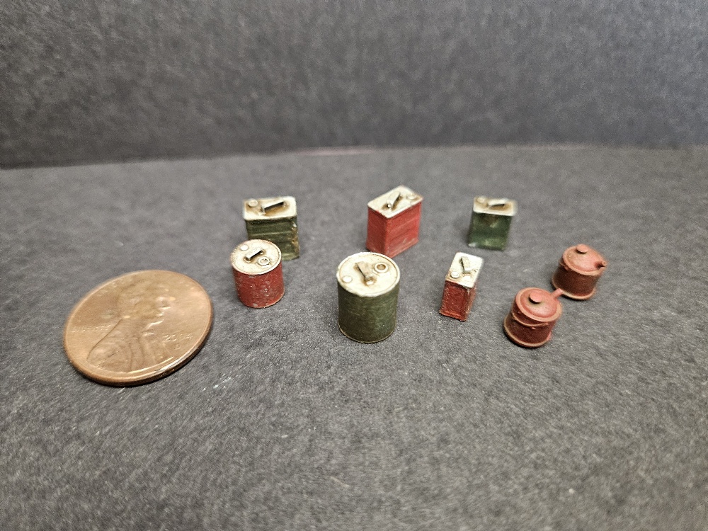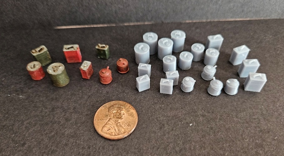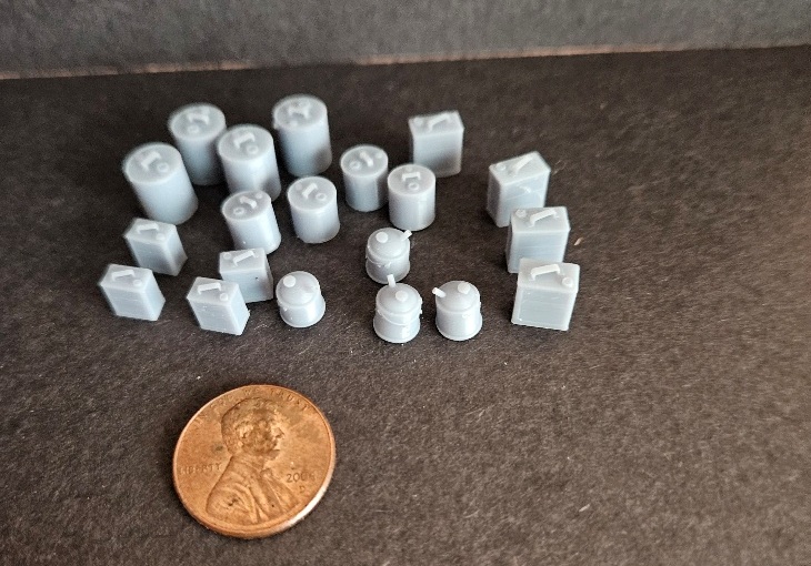 Here we have a set of 3D printed fuel cans and several different small cans. The set has 20 small detail containers and come unpainted. In the pictures you can see what the different fuel cans could look like painted.