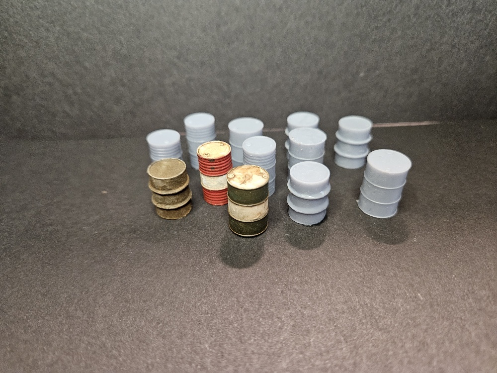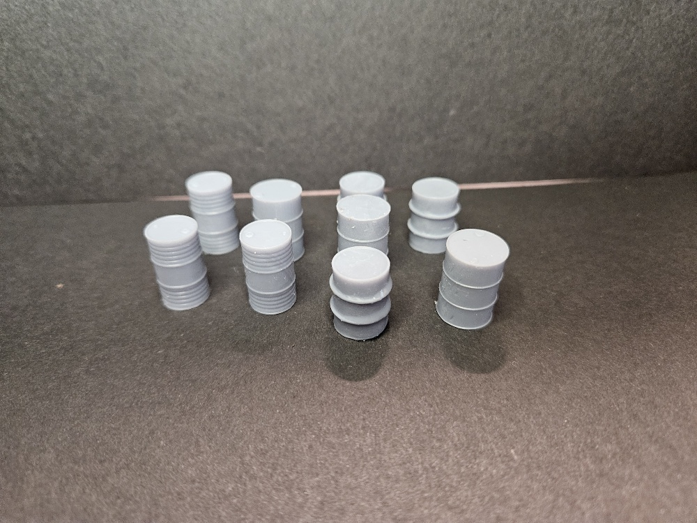 Here we have a set of 3D printed Oil Barrels in three different drum styles. The set of 9 barrels total comes unpainted. In the pictures you can see what the oil barrels could look like painted.