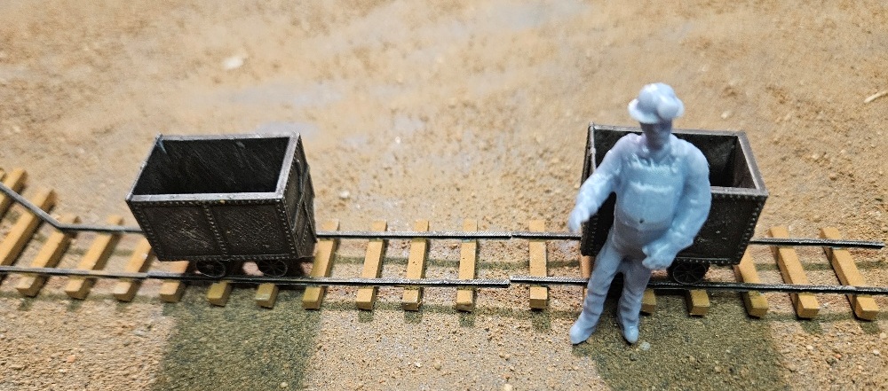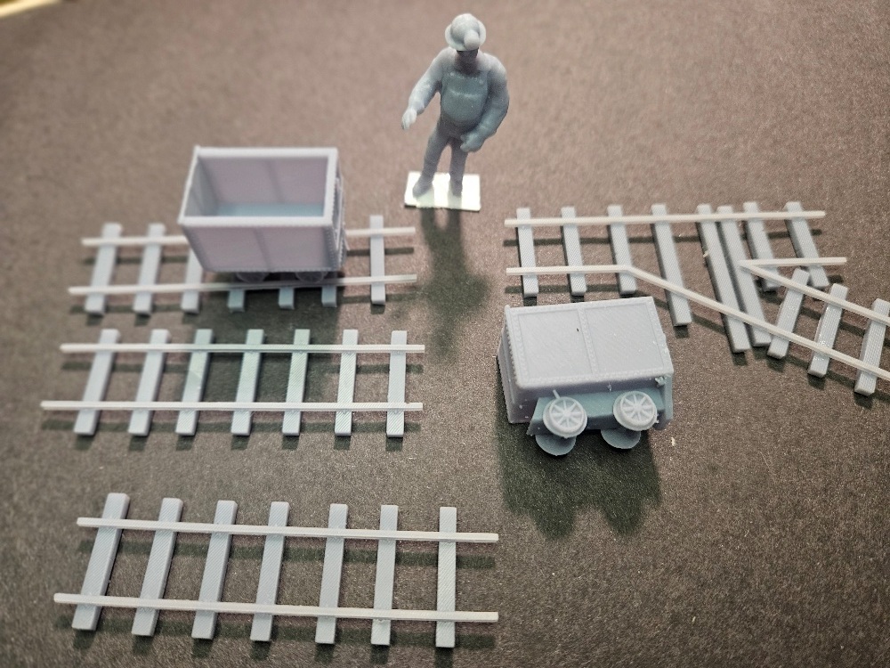 Here is the O scale complete 3d printed mining set. It includes the two mining cars. Then a set of mine track 3 straight and one switch and Miner Mike what a deal. 3d prints are unpainted