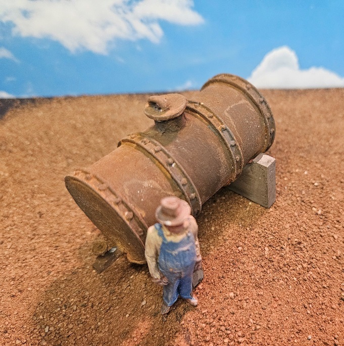 HeThis is a oil tank on concrete supports. You also receive a 3D printed valve to add to the tank The oil tank measures 2 1/2" by 1 3/8" and 1 3/4" tall. All resin casting unpainted.