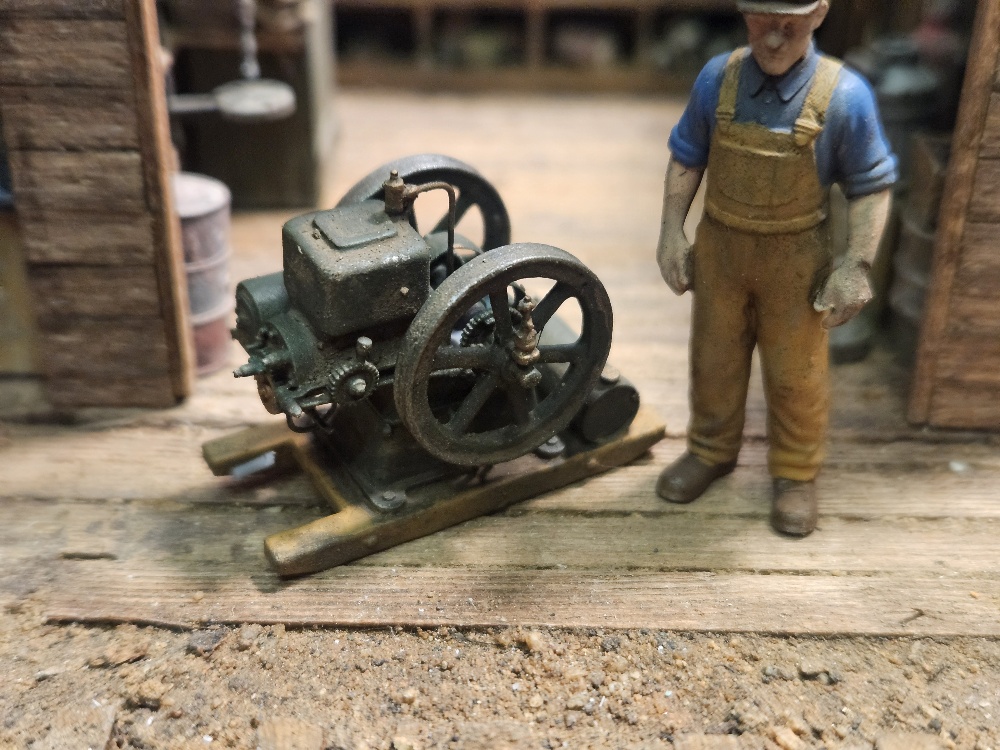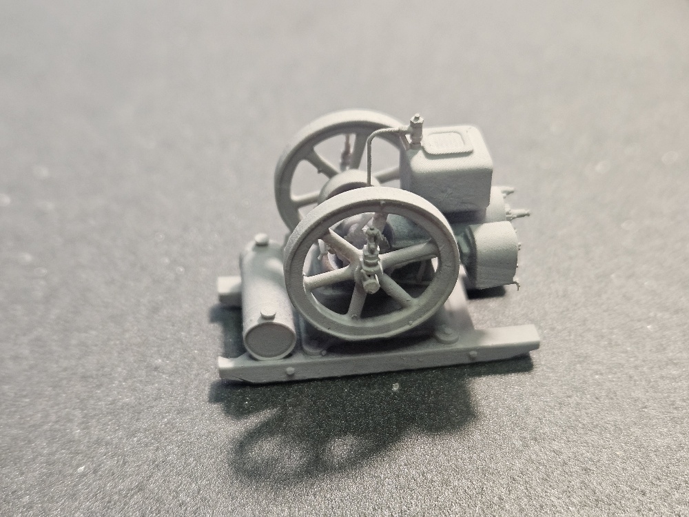 Here is another Hit and Miss engine. This 3D printed engine does not require any assembly and is a one piece print. You all you have to do is prime and paint. The engine is 1 1/4" long by 5/8" wide by 1" tall. the figure is not included.
