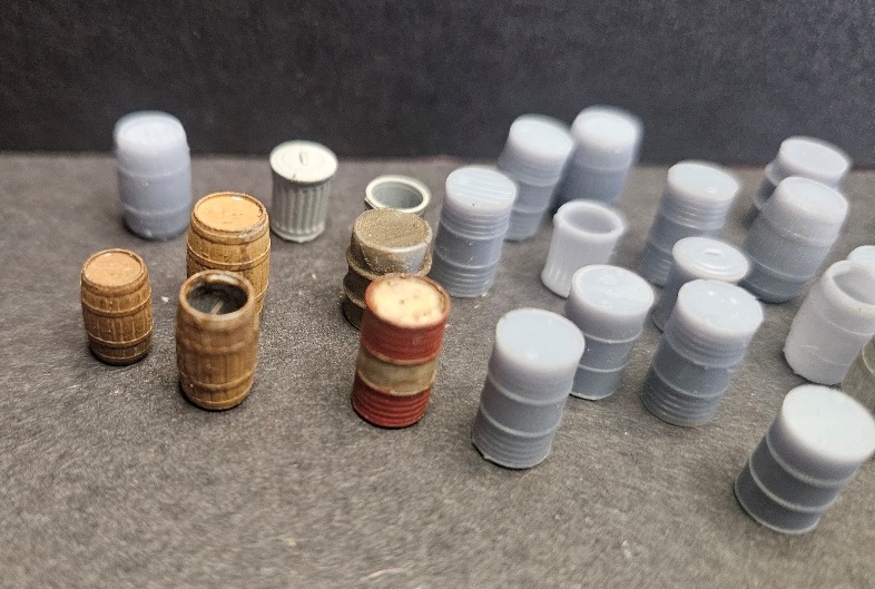 RRBS-H-01Here is a set of 3 different styles of oil drums, Wood barrels different sizes some open and closed and trash cans open and closed. You can see what the items look like painted. These are 3D printed and come unpainted.