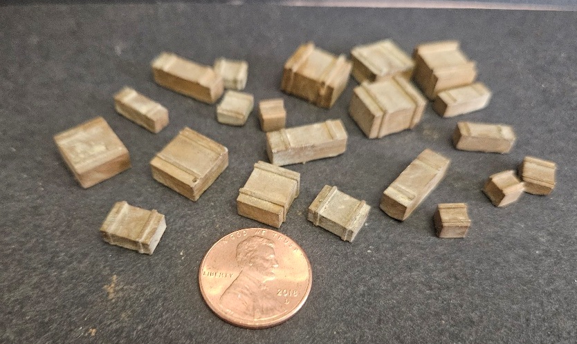 RRBS-H-07Here we have 20 boxes 2 of each different sizes for your freight house or warehouse. You can see what the items look like painted. These are 3D printed and come unpainted.