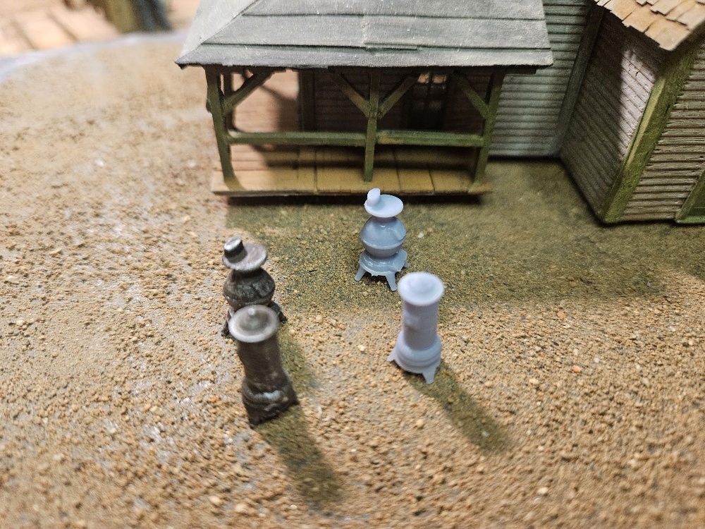 Here is two different wood or coal burning stoves a potbelly and a larger heating stove and are both 3D printed. You get 3 of each stove for a total of six stoves. The stoves come unpainted.