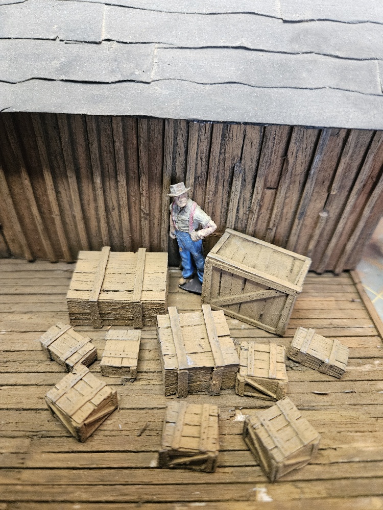 Here is a stack of boxes w/o a base. You can use these in a shop. The casting is 1 3/4" long and 1" wide and 1 1/4" high. All resin casting and comes unpainted. Figure not included.